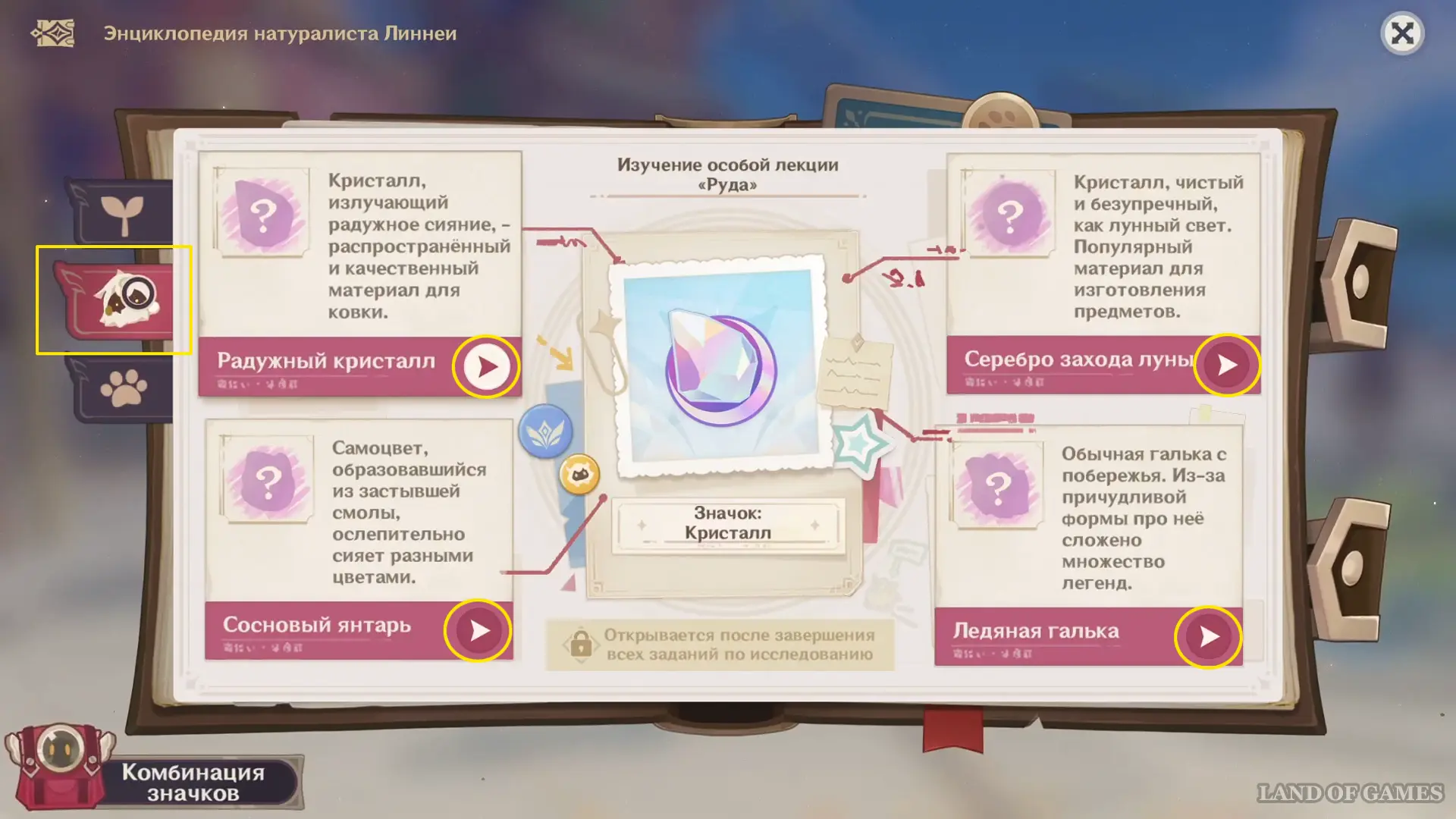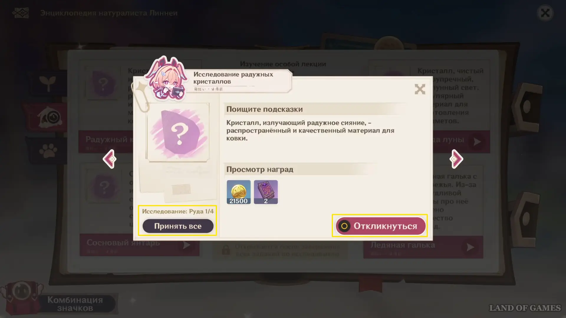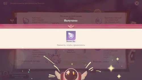 Узнайте результаты голосования за самый красивый камень Нод-Края и выслушайте наблюдения Линнеи. В награду за квест вы получите 20 примогемов, 2 фиолетовые книги опыта и значок «Кристалл» — его можно повесить на рюкзак лучницы через раздел «Комбинация значков» в левом нижнем углу Энциклопедии.