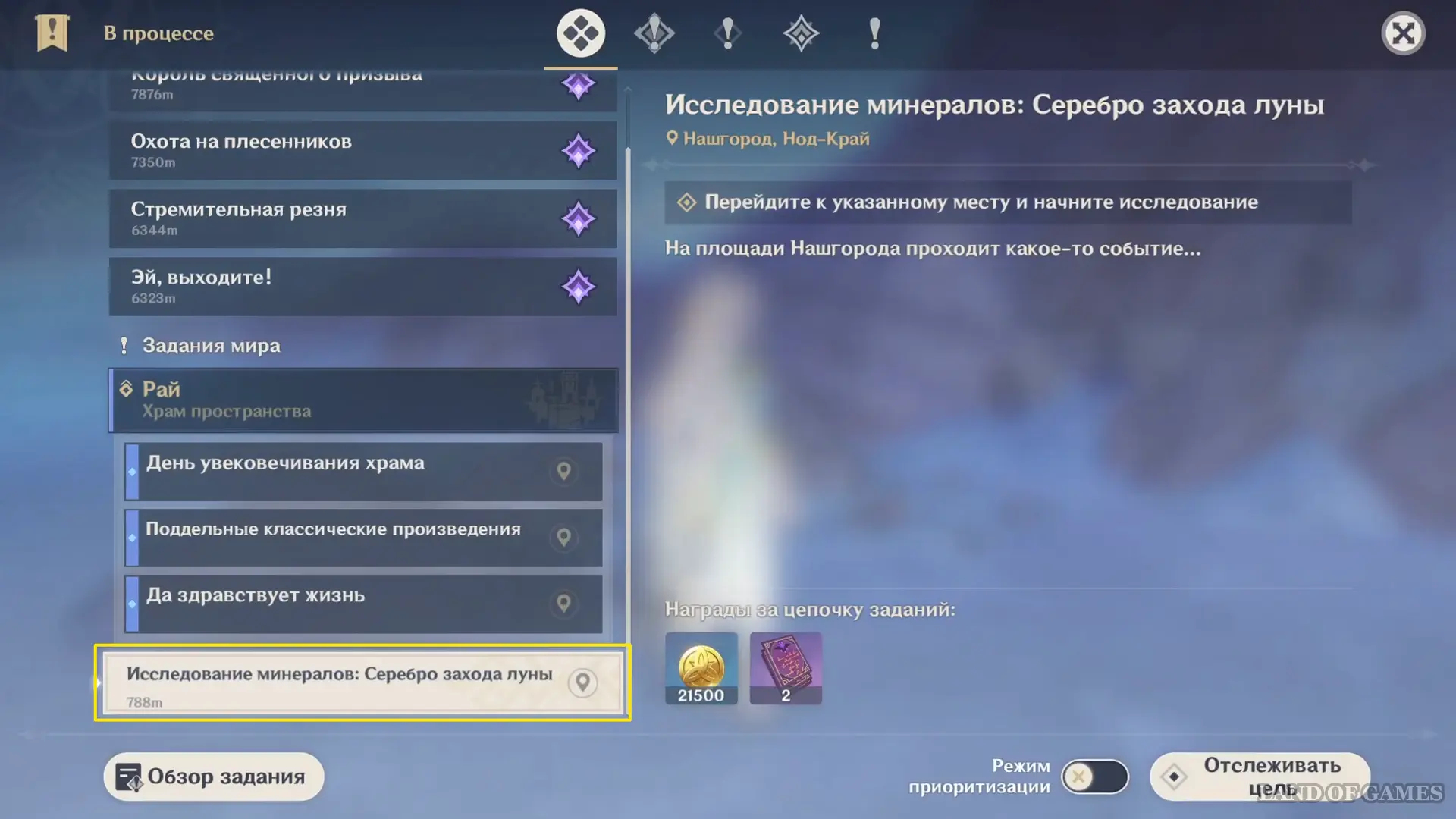 За каждое исследование предусмотрена фиксированная награда: 2 фиолетовые книги опыта и до 21 500 моры.