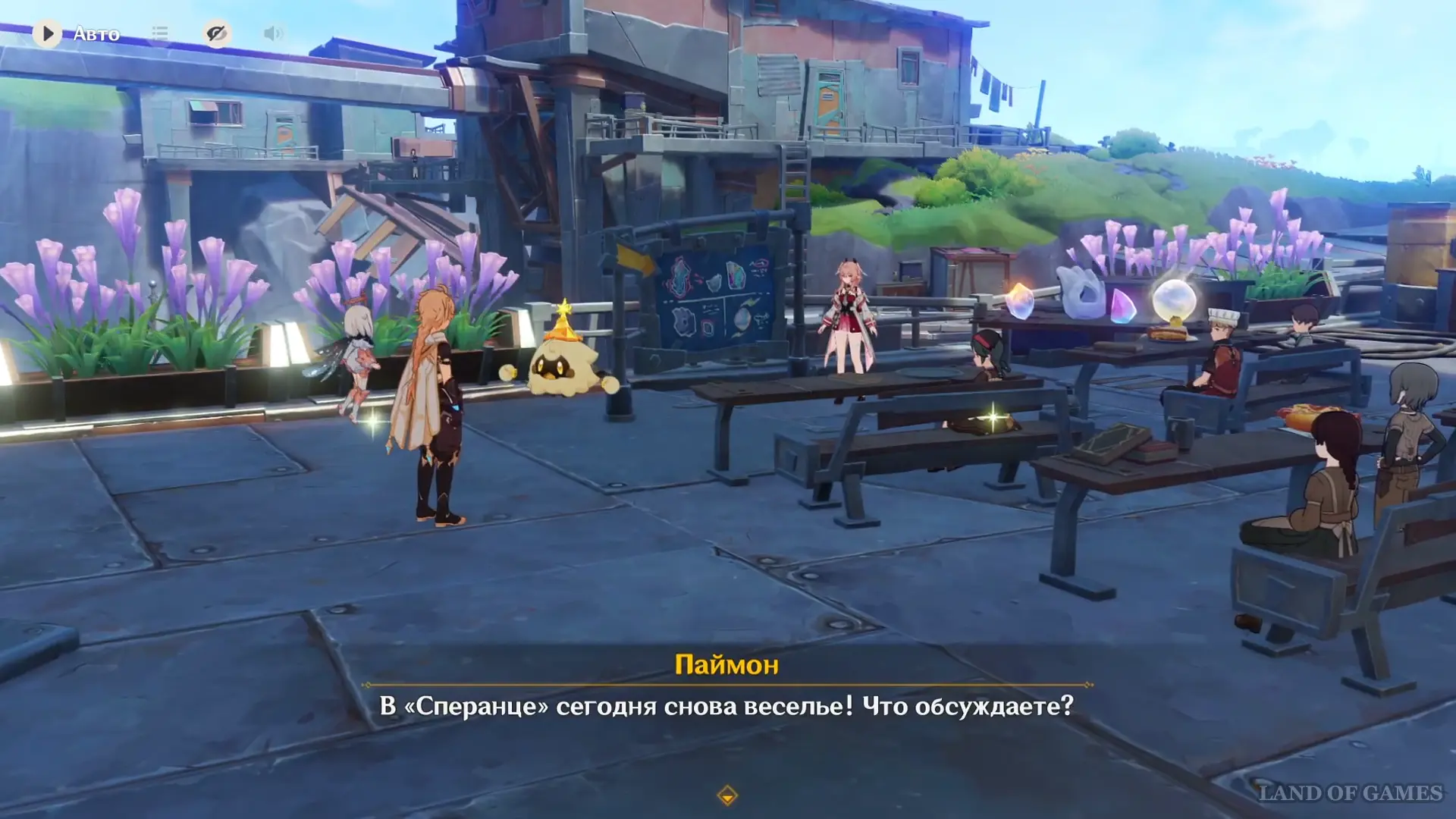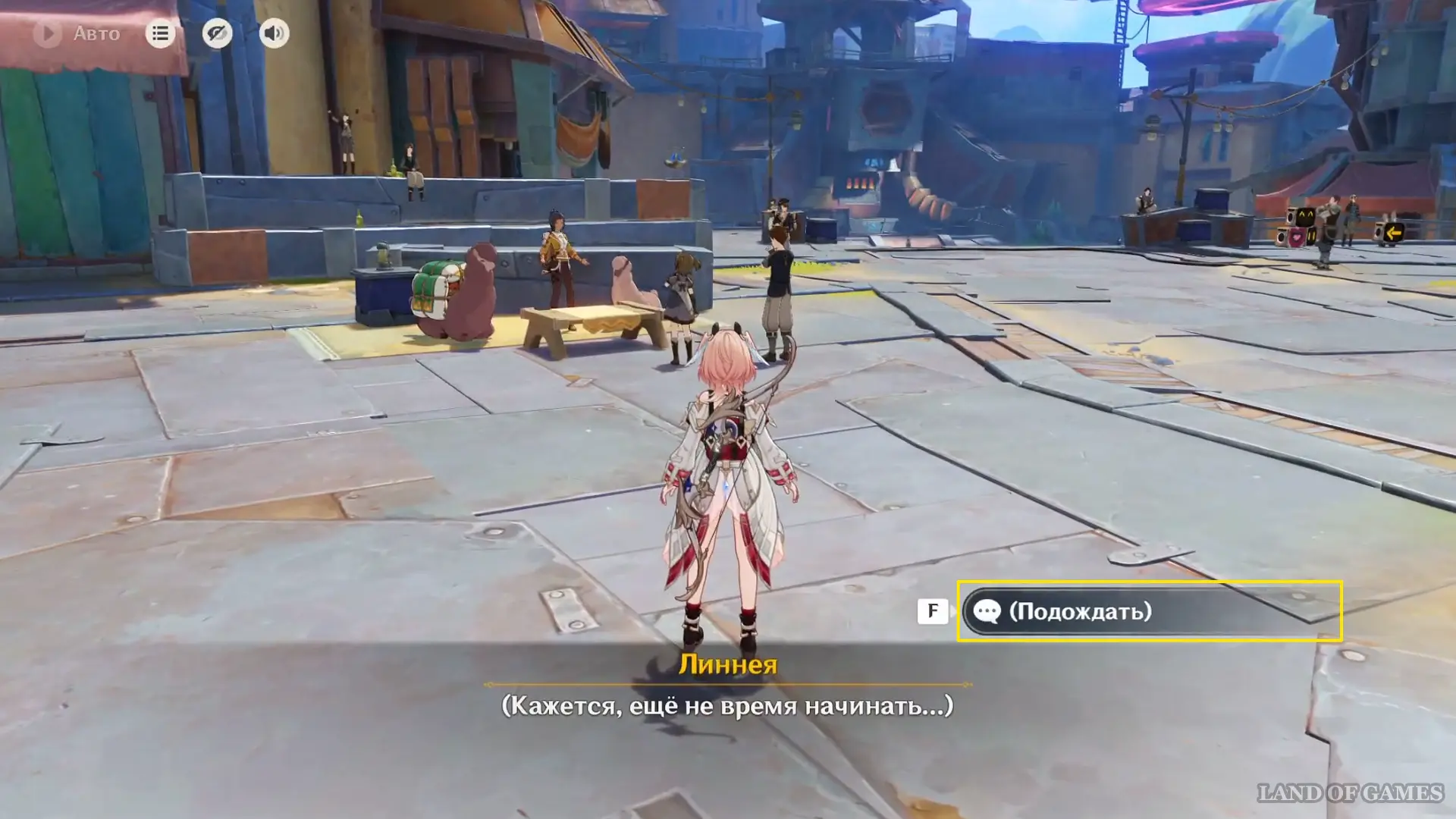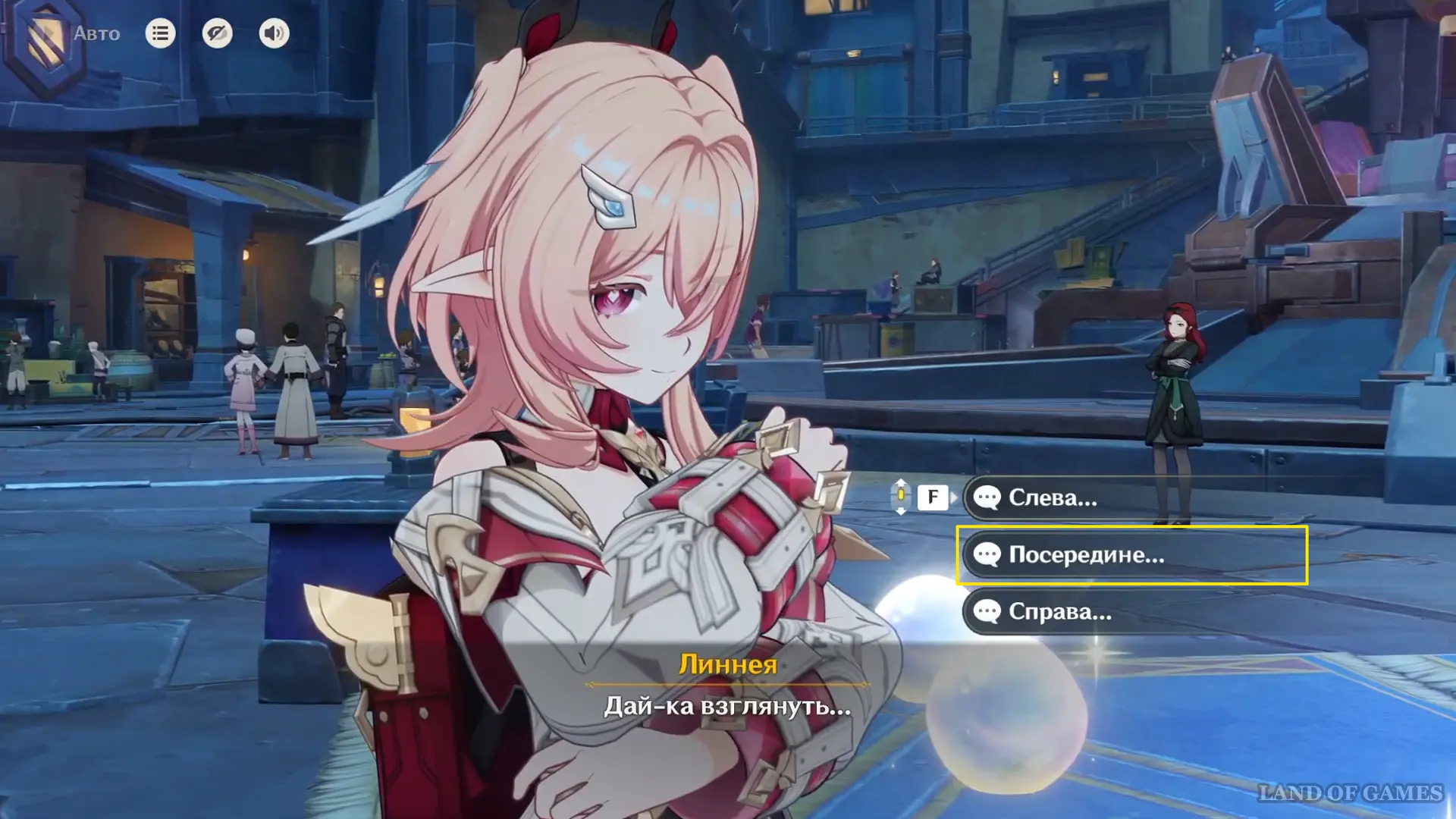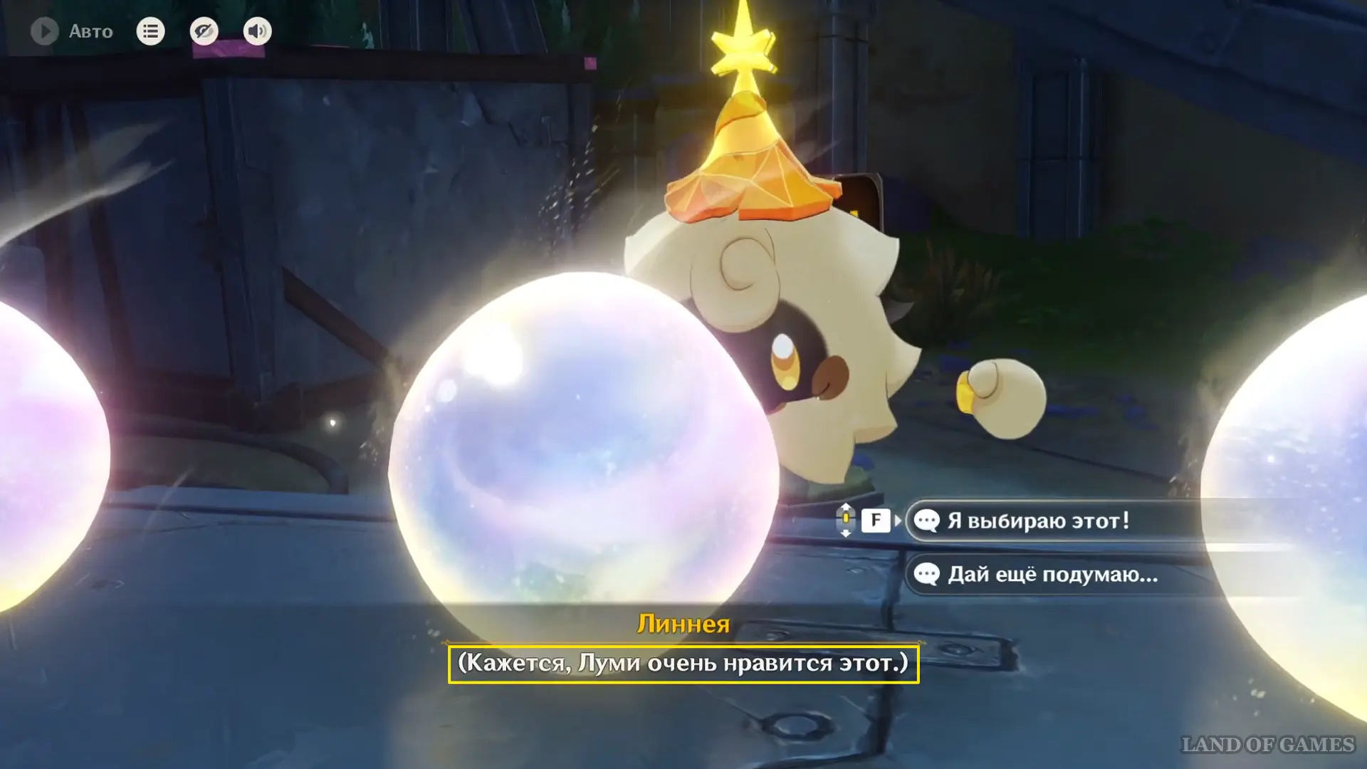 К вечеру на площади развернется выставка образцов Дороты — поговорите с ней и в ходе диалога угадайте самый уникальный камень. Правильный вариант — «Посередине...», на него укажет реакция Луми. При выборе ответа вы сначала увидите подсказку питомца, а уже после сможете принять окончательное решение.