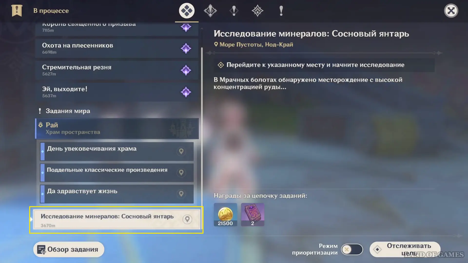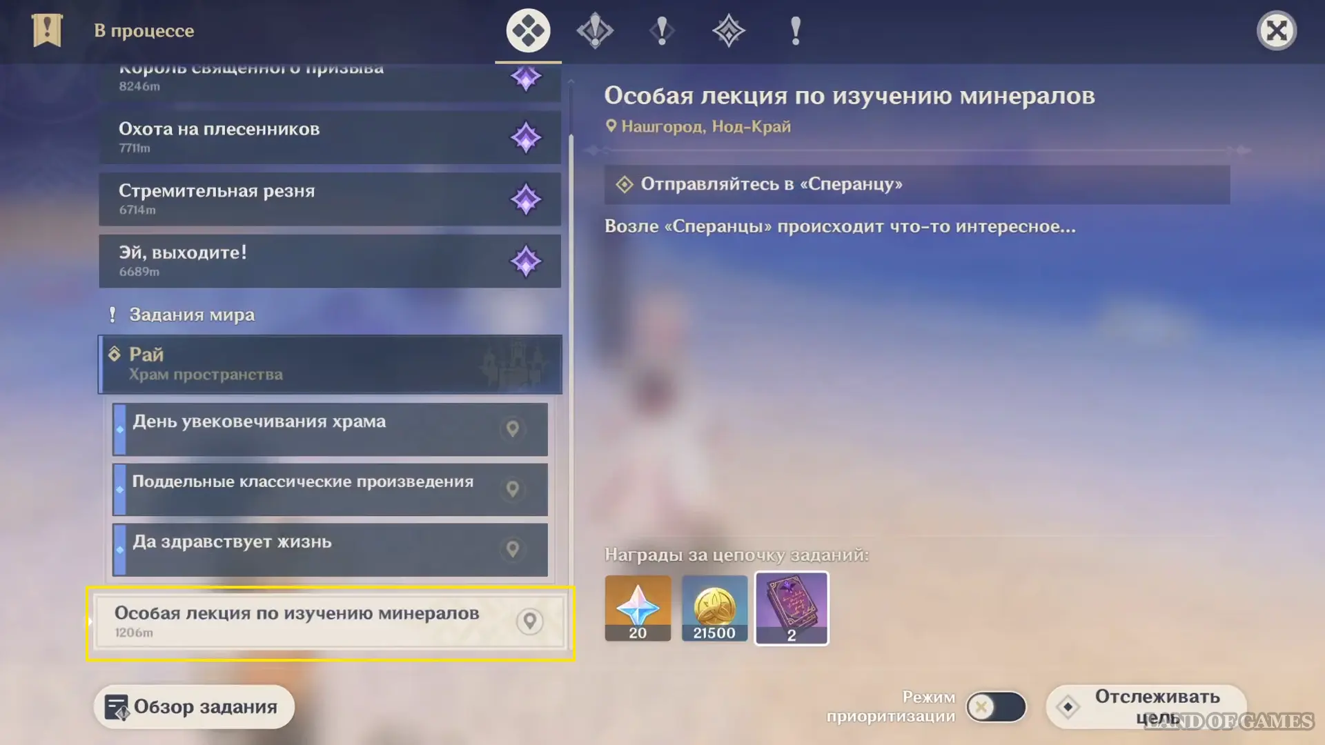 Откройте справочник через инвентарь и выберите среднюю закладку слева — это страница изучения особой лекции «Руда». К запуску вам будут доступны 4 миссии, которые можно активировать по отдельности или отслеживать все сразу.