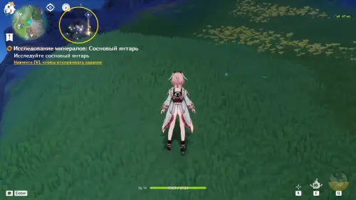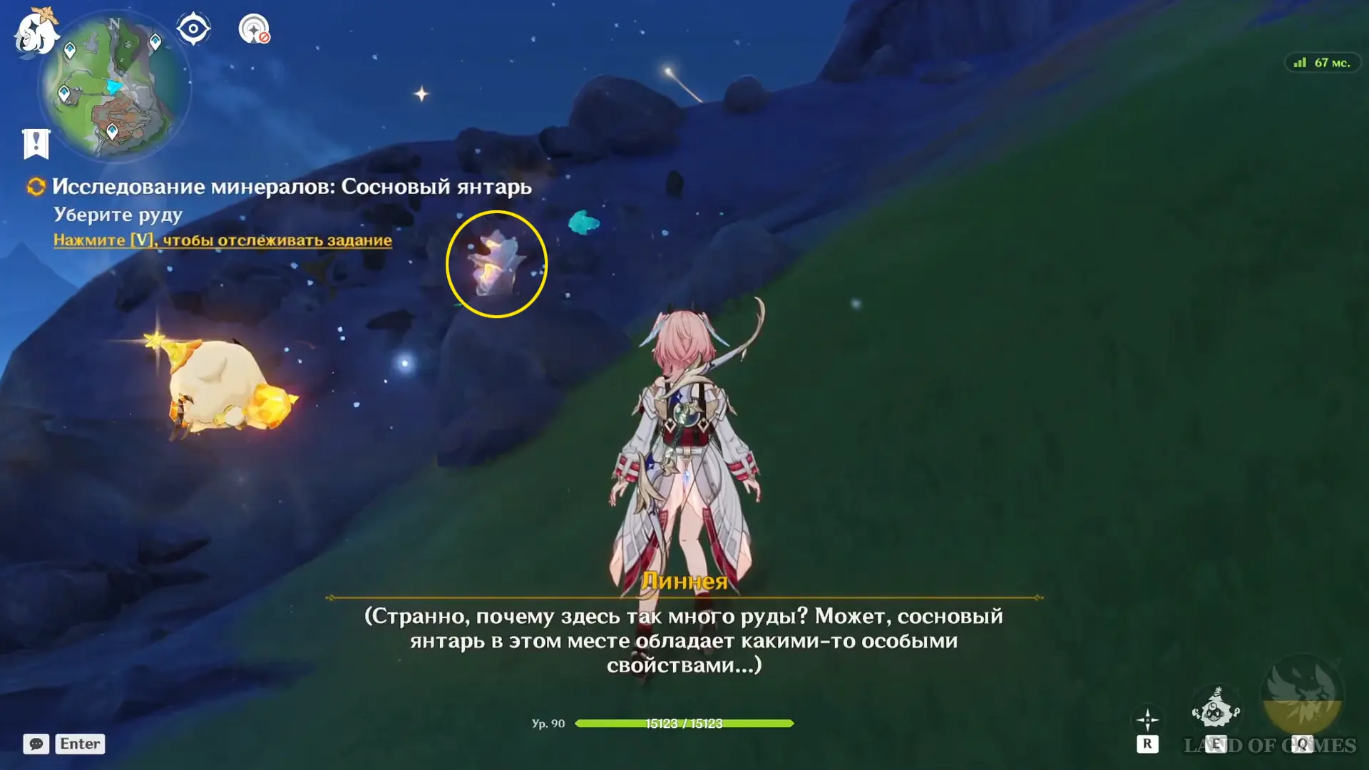 Подойдите к груде камней, отмеченной квестовым маркером, и выстрелите в нее за Линнею. Дождитесь, пока Луми уберет лишнюю руду, после чего подойдите к скале и соберите Сосновый янтарь вручную — это финальная цель исследования.