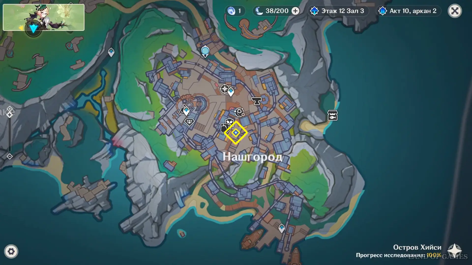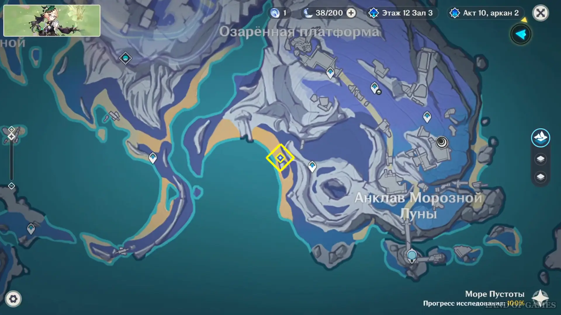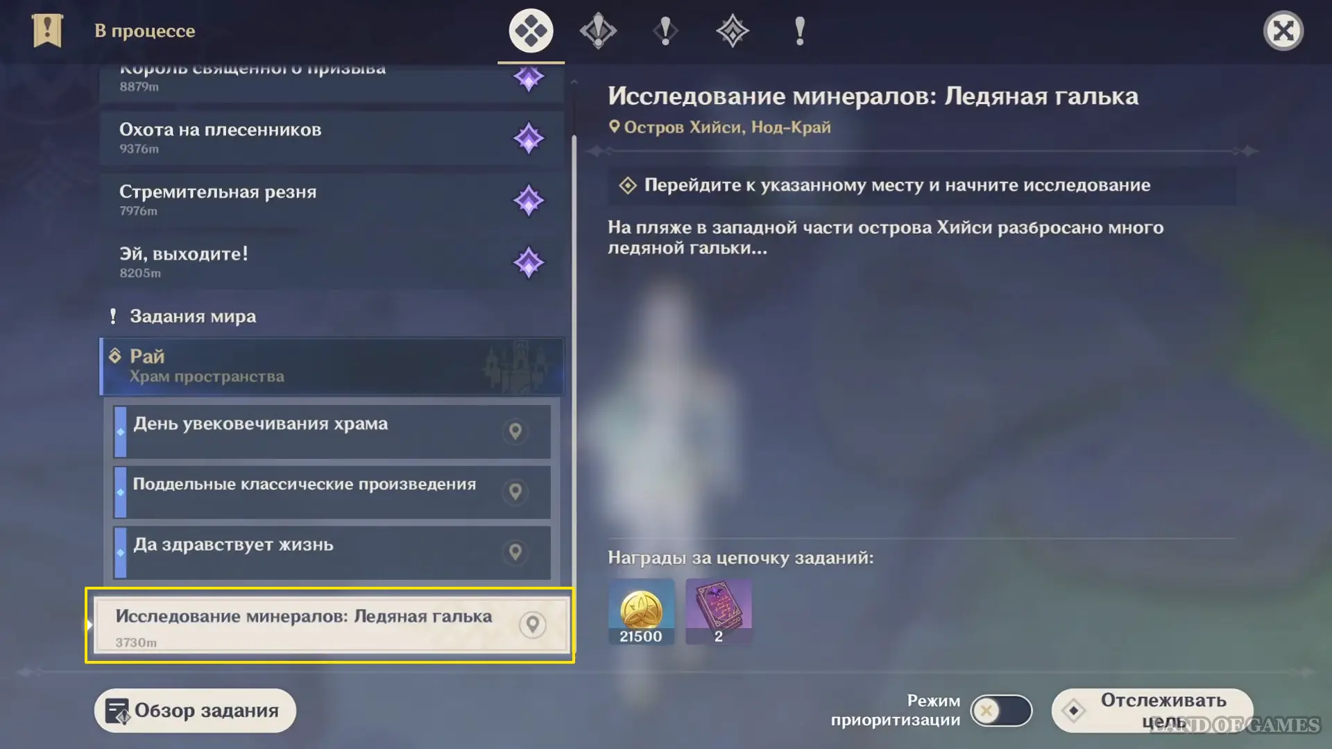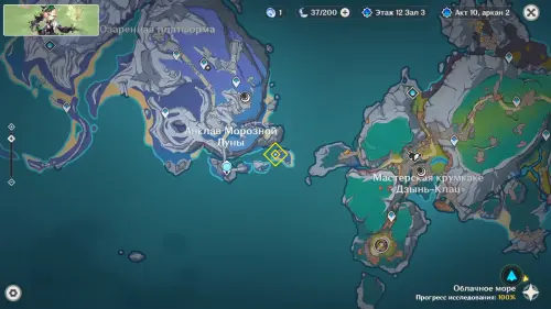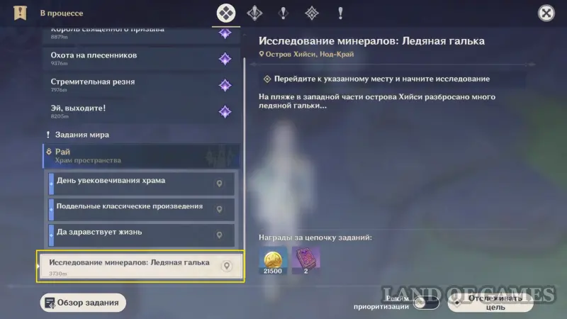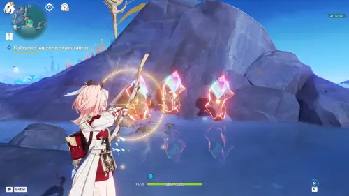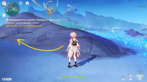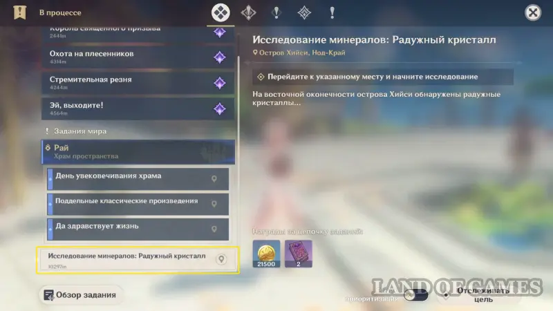 Исследование Радужного кристалла проходит на участке земли к востоку от Статуи Архонта на острове Хийси (неподалеку от Зеркала полнолуния).