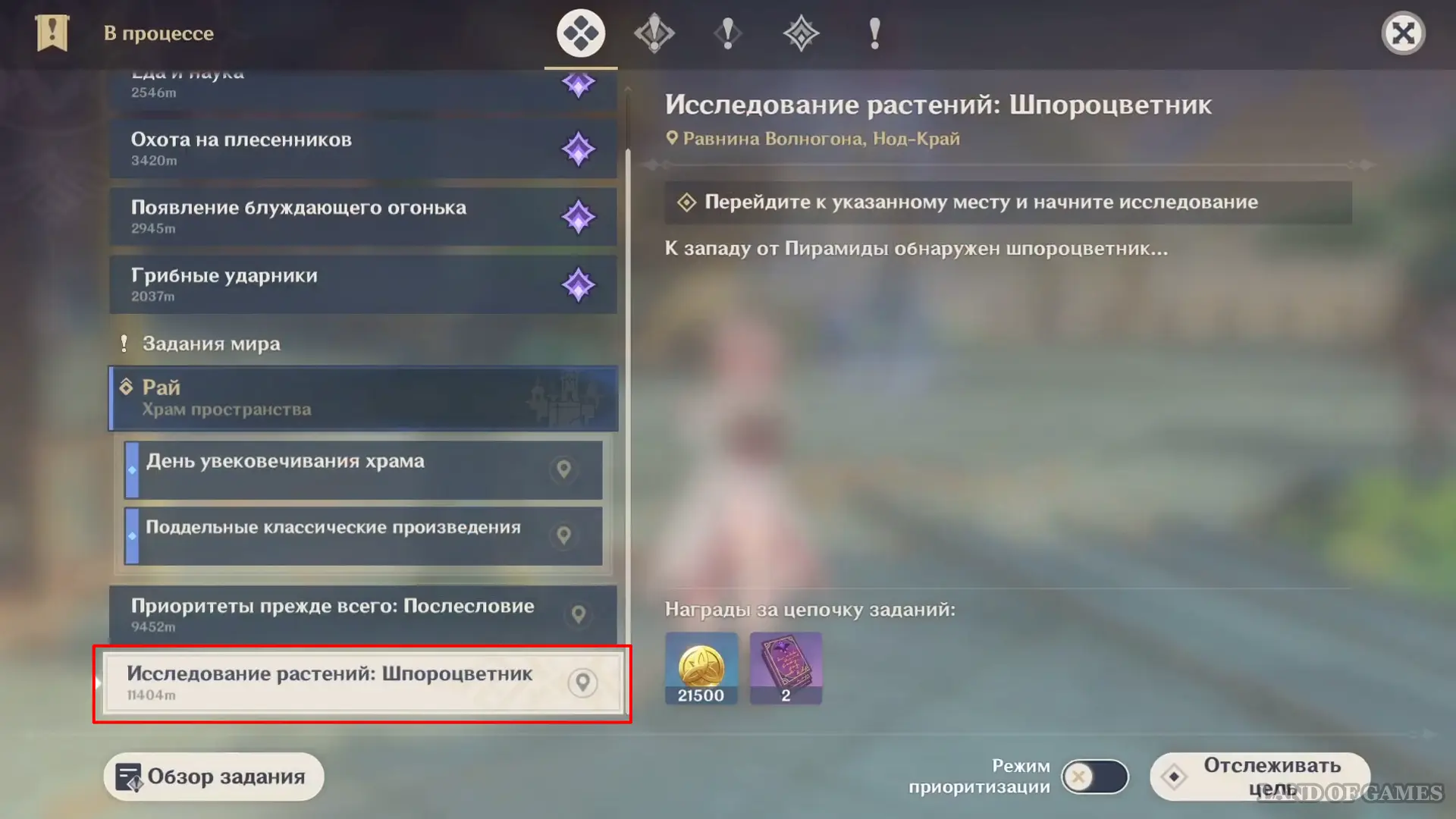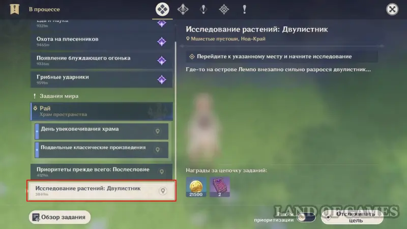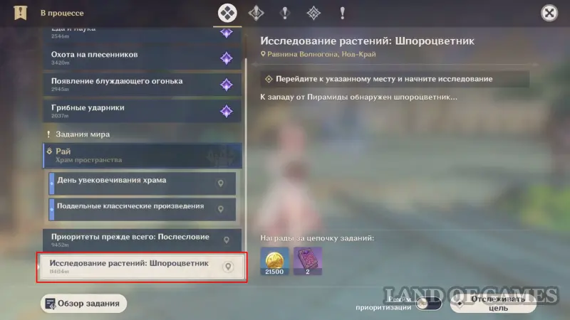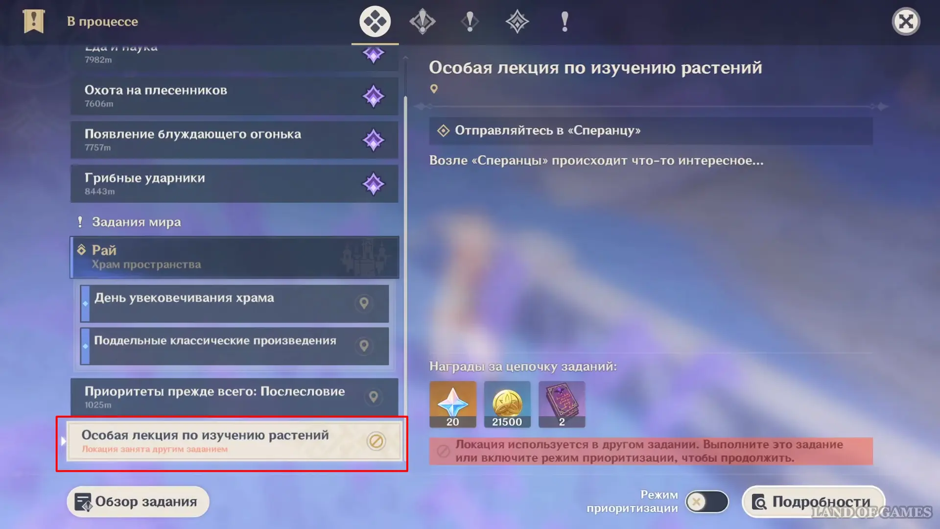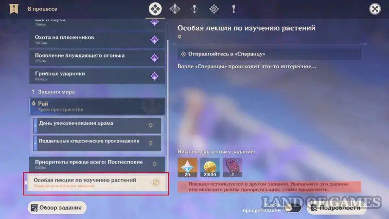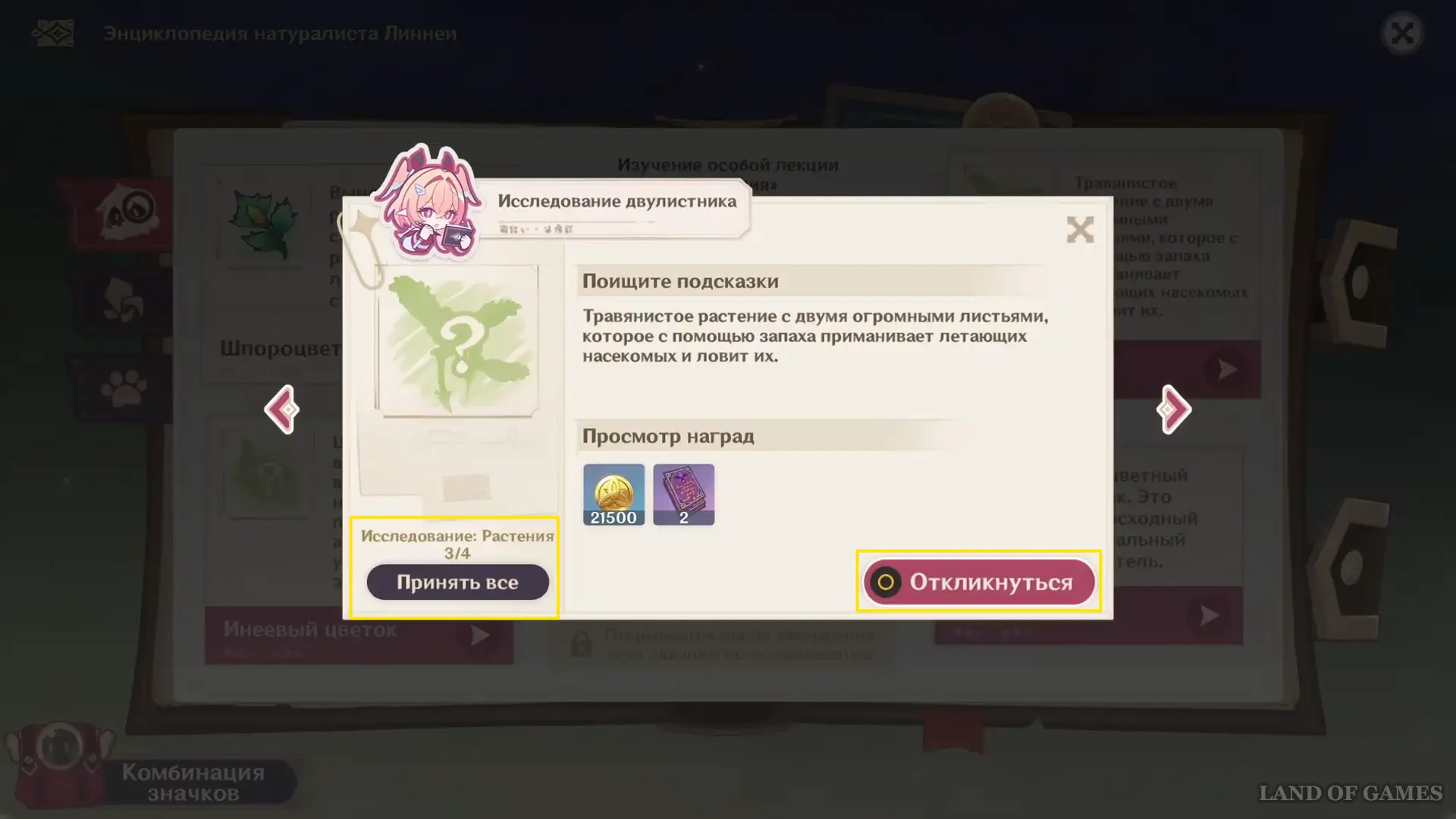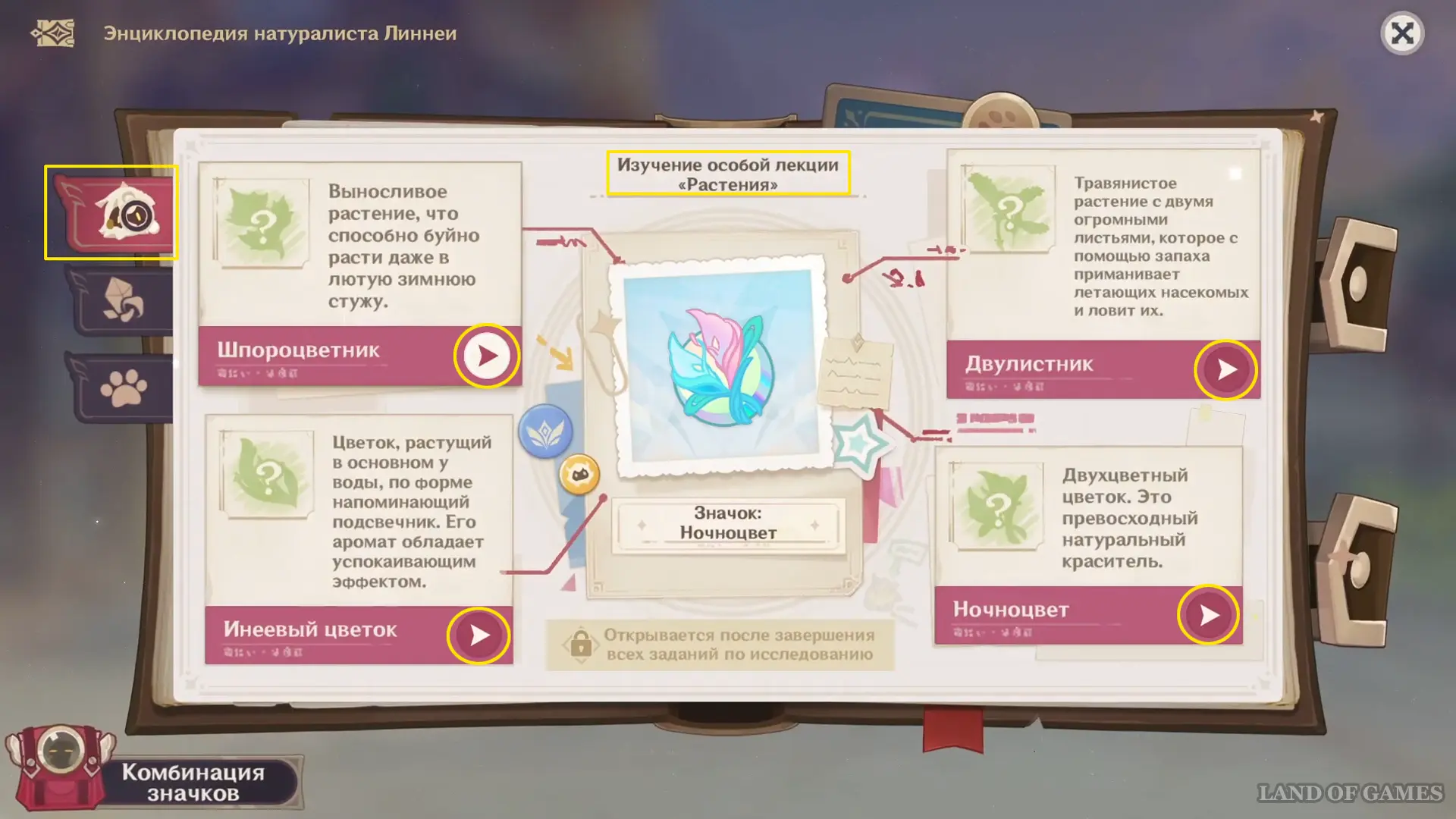 Откройте справочник через инвентарь и перейдите на верхнюю закладку слева — это страница изучения особой лекции «Растения». К запуску вам будут доступны 4 миссии, которые можно активировать по отдельности или отслеживать все сразу.