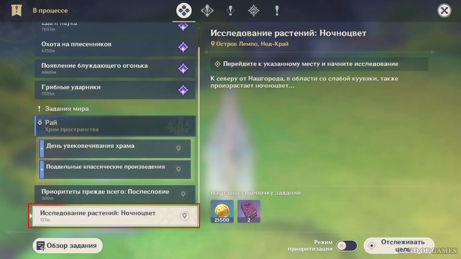 От места, где был завершен предыдущий этап исследования, спускайтесь на тропу со слабой куувяки (север Нашгорода) и найдите Ночноцвет.