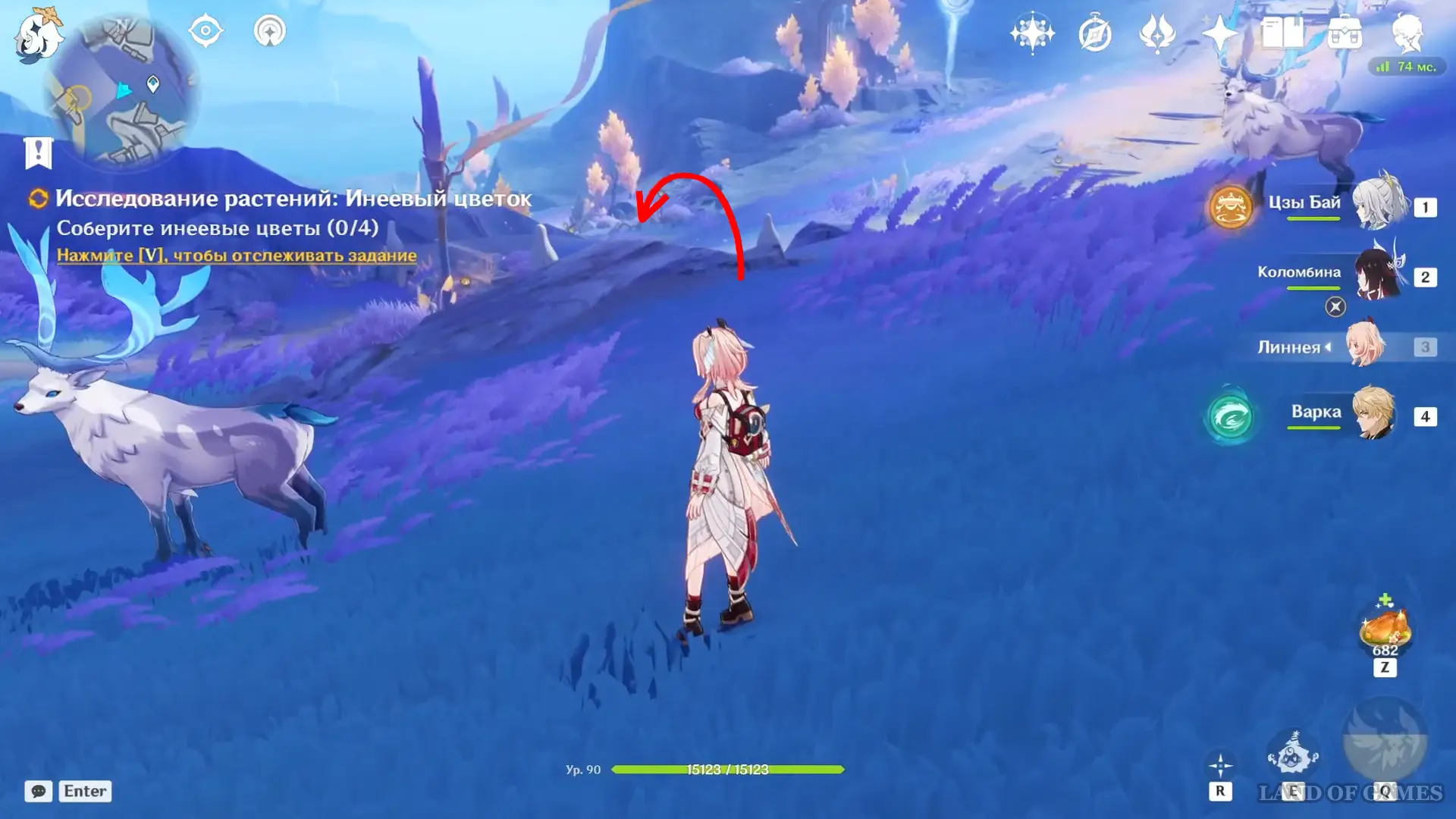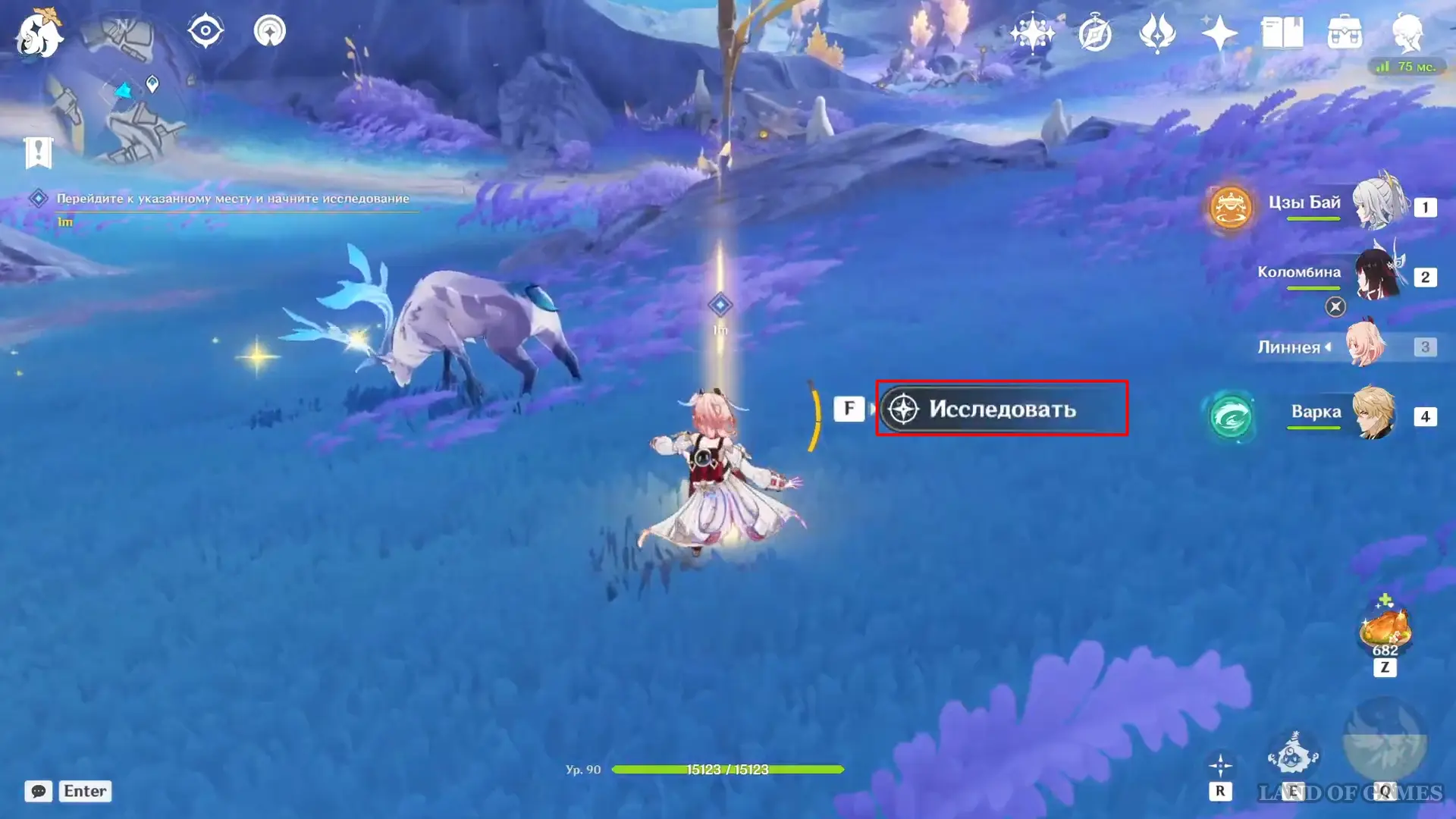 Подойдите к квестовому маркеру на поляне с оленями, начните исследование и спуститесь к тропе на запад — у каменного забора и статуй вы найдете все четыре образца.