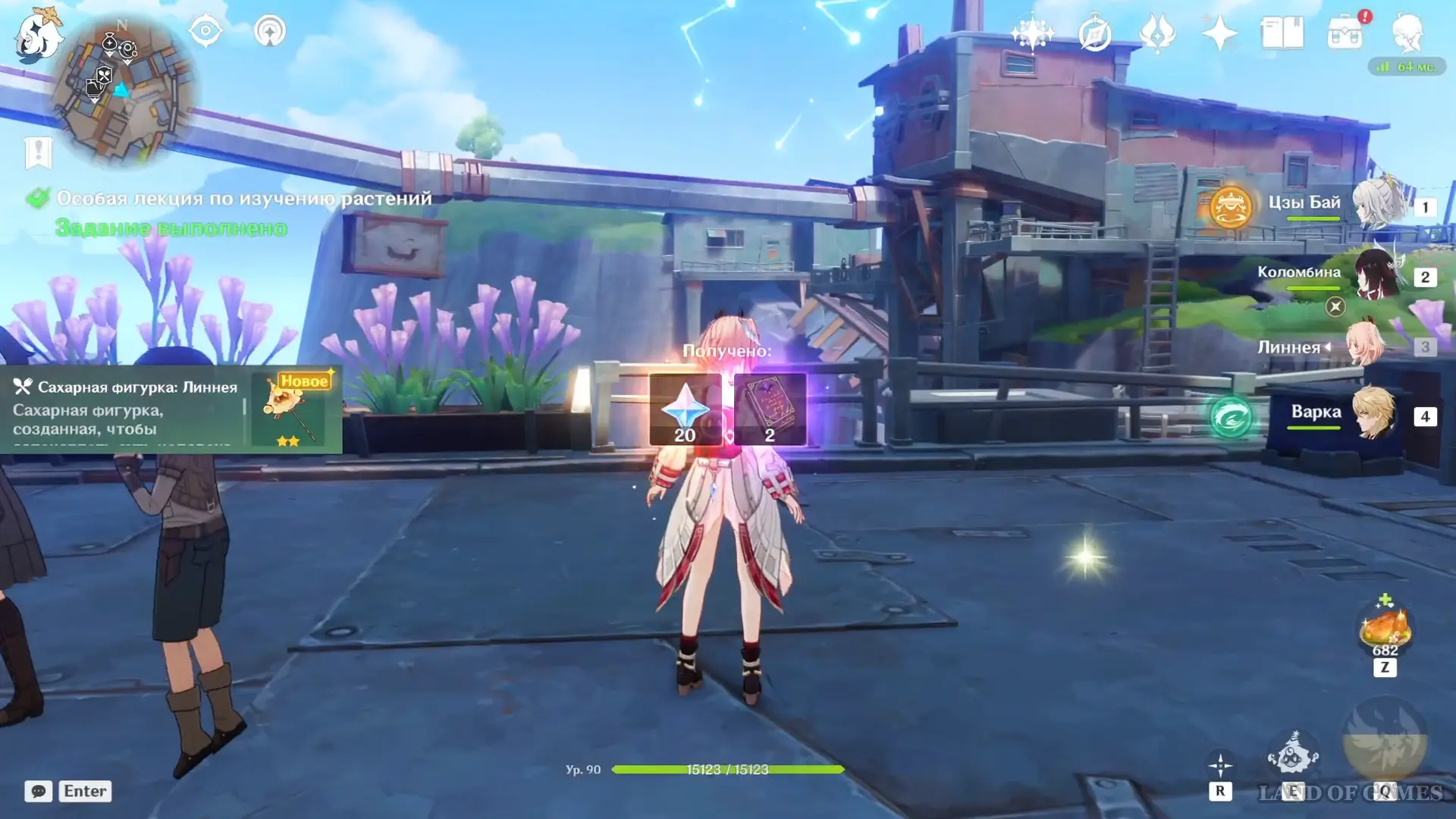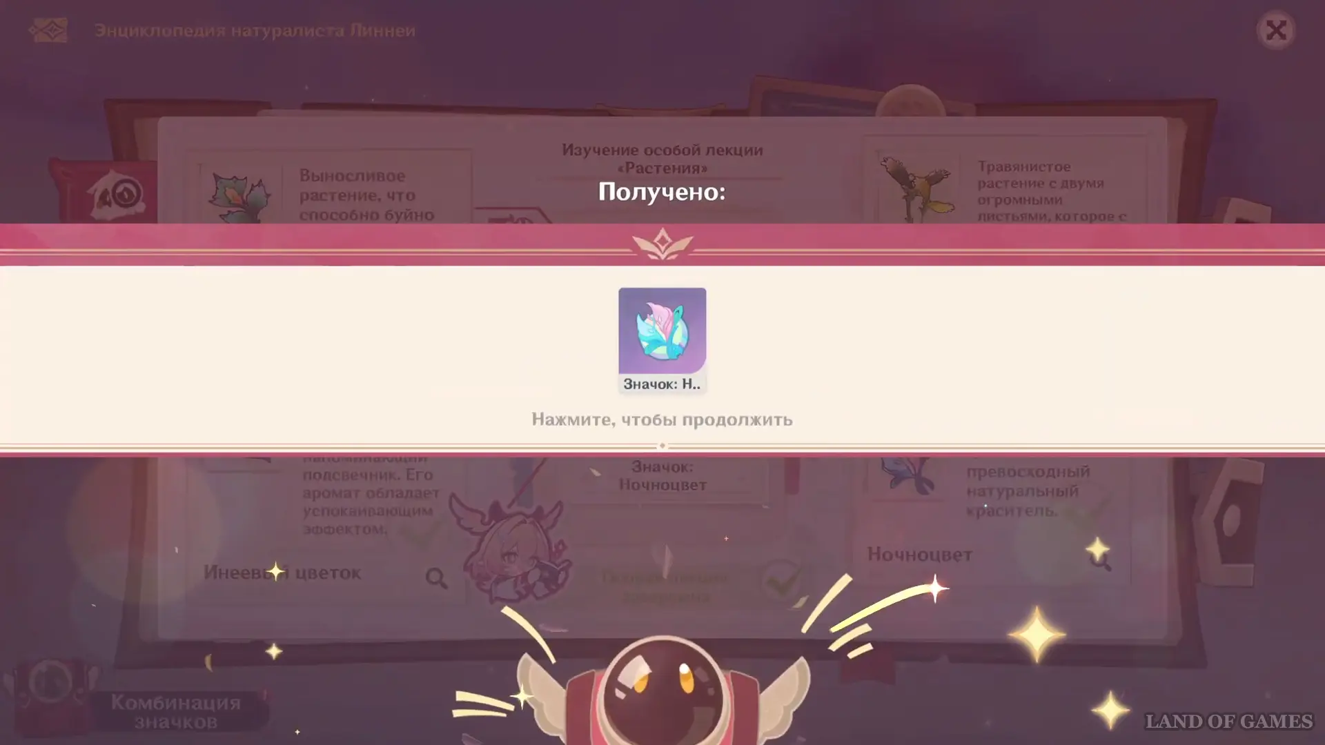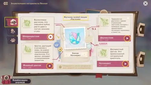 В конце лекции вы получите 20 примогемов, 2 фиолетовых книжки опыта, от 20 тысяч моры, сахарную фигурку Линнеи и значок «Ночноцвет». Последний можно закрепить на рюкзаке героини через вкладку «Комбинация значков» в левом нижнем углу Энциклопедии.