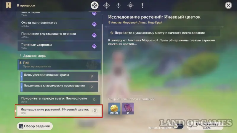 Инеевый цветок получится исследовать на северо-западе анклава Морозной Луны (остров Хийси, около места прокачки репутации).