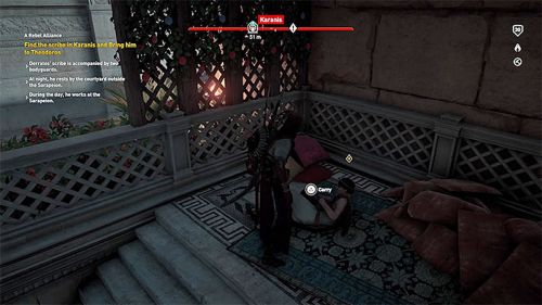 Идите на виллу Леандра и отправьте своего ястреба на разведку, чтобы узнать точное местонахождение книжки. Здание будет охраняться несколькими стражниками. Идите на 2-й этаж и возьмите нужный предмет. В комнате с ним можно также найти два сокровища. Затем вернитесь к Диоклу и разберитесь со всеми противниками. В конце поболтайте с квестодателем.