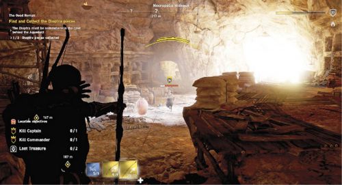 Поднимитесь наверх, заберитесь на стену и пройдите через дыру в потолке. Воспользуйтесь Сену, дабы отыскать потерянные реликвии – они расположены в южной области Акрополя римлян. Сначала отметьте всех противников в зоне с помощью ястреба, а потом вскарабкайтесь на угловую стену, находящуюся на юге. Там вы не встретите стражников. Подойдите к солдату, смотрящему в окошко и убейте его. Затем выстрелите в солдат, находящихся впереди на стене (используйте дротики или стрелы).