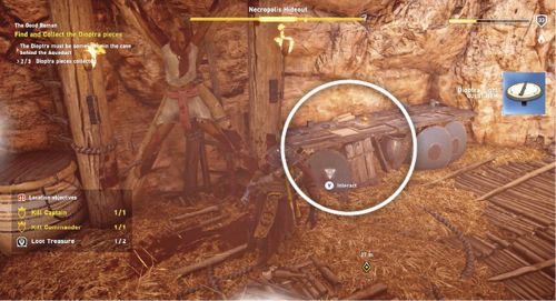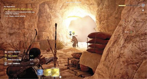 Направляйтесь к гробнице Бата I и поболтайте там со жрецом по имени Иакх, стоящим рядом с толпой протестующих. Далее заберитесь на одну из колонн могильника. Пролезьте через дыру на крыше и спрыгните в бассейн во внутреннем дворе. Далее спуститесь в гробницу. Изучите две витрины, расположенные с двух сторон огромной статуи. В храме нет двух важных артефактов: медальона и лука.