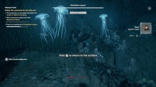 Направляйтесь в южную область Серифоса и пообщайтесь там с девочкой. Согласитесь помочь ей в нахождении жемчуга и блестящих камешков. Сначала направляйтесь в бухту с подводной пещерой. Нырните и отыщите жемчуг рядом с проходом в пещеру. Продолжайте погружаться, пока не войдете в тоннель. Там находится сундук с еще двумя жемчужинами.