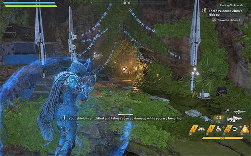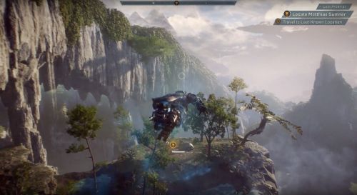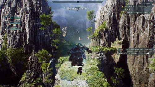 Летим к новому маркеру и активируем еще одно реле, находящееся в пещере. Сканируем окрестности и расправляемся с чудищами. Направляемся к новой панели, с которой нужно взаимодействовать. Пока не обращаем внимания на парящих противников. Тут мы также можем научиться парению в воздухе, нажав на клавишу «С», находясь в полете и выбрав режим прицеливания. В этом случае джавелин сможет зависнуть над землей.