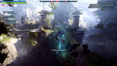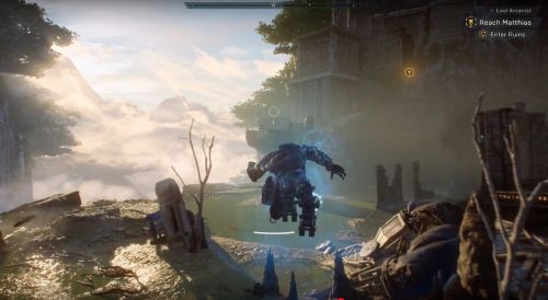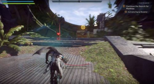 Летим в отмеченное местечко и осматриваем лагерь Матиаса. Затем направляемся к указателям, которые распределены по локации, собирая по дороге разнообразные материалы. Вскоре нам скажут найти оборудование Архологов – летим в дальнюю область руин и обнаруживаем устройство с белым флагом. Внезапно возникнут ульи Шрамов. Уничтожаем монстров и их гнезда. Не забываем подбирать с убитых противников аптечки и боеприпасы.
