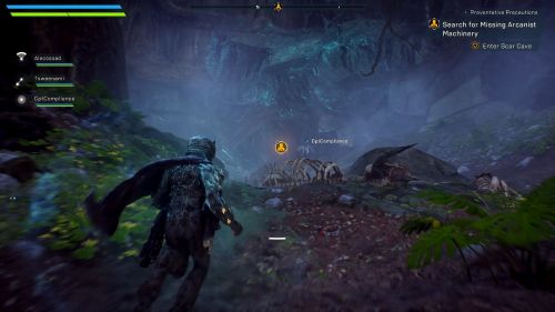 Долетев до необходимой локации, расправляемся со Шрамами и осматриваем сломанный джавелин. Идем к пещере, уничтожаем элементалей и проходим внутрь. Разбираемся с еще несколькими противниками в различных участках подземелья.