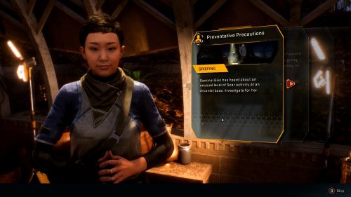 Беседуем с Тассин, находящейся в Тарсисе, дабы разузнать больше информации о миссии. Взяв квест и послушав Оуэна, направляемся вслед за указателями, пока не попадем в лагерь Вершителей. Тут мы столкнемся с Вивернами. Разбираемся с чудищами и находим коробку с подсказкой, воспользовавшись радаром в верхней части экрана.