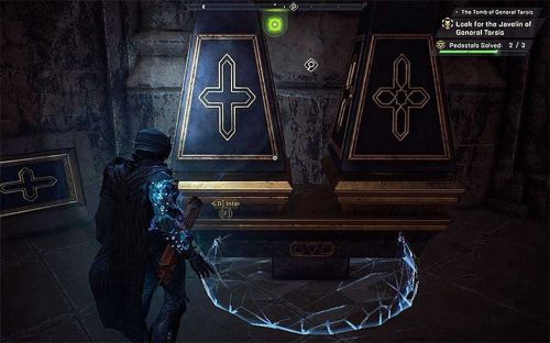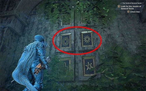 Открыв дверь, проходим в дальнее помещение и снова убиваем скорпедонов. Теперь нам нужно будет отпереть еще одну дверь, вновь решив головоломку с тумбами. Теперь будут 3 набора по 2 колонны каждый. Возле тумб на стенах изображены символы. Вставляем их в левые колоны, а для правой подбираем картинку вручную. Разобравшись со знаками, входим в гробницу генерала Тарсис и просматриваем длительную кат-сценку.