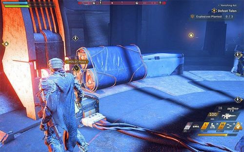 Отправляемся к новому указателю и входим в подземелье, которое называется «Литейная». Летим вглубь локации и сталкиваемся там с Таллоном. Его будет окружать силовое поле, которое защищает от любого урона. В центре локации находятся 3 генератора, которые необходимо уничтожить. По периметру разбросана взрывчатка – за раз мы сможем перетаскивать всего одну бомбу. Однако первым делом разбираемся с бандитами, а уже потом минируем генераторы.