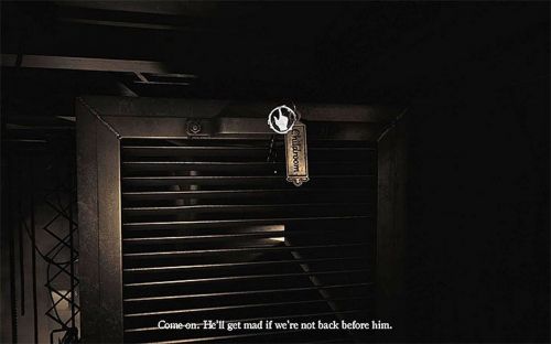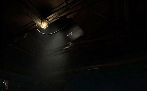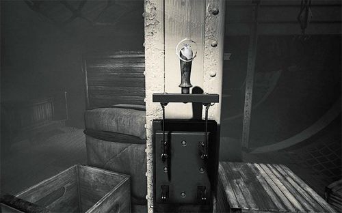 Проходим дальше, спускаемся по ступенькам и обнаруживаем схему корабля в начале коридора. Идем еще дальше вниз, мимо ребенка, пролезающего через решетку. На нижнем этаже находим записку в тумбе. Продвигаемся вперед и перед новой дверцей обнаруживаем еще одну запись на лавочке с правой стороны. Входим в складское помещение и поднимаем с бочонка разбитый фонарь. Пройдя чуточку вперед, взаимодействуем с рукояткой на левой балке для подъема груза.