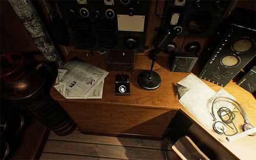 Встаем на корточки и ползем под доской. Оказавшись в комнате с ковром, находим трость в подставке с левой стороны. Спускаемся, входим в радиорубку и обнаруживаем на столе наушники. Используем систему для переговоров по радио, а после выключения электричества выбираемся наружу.