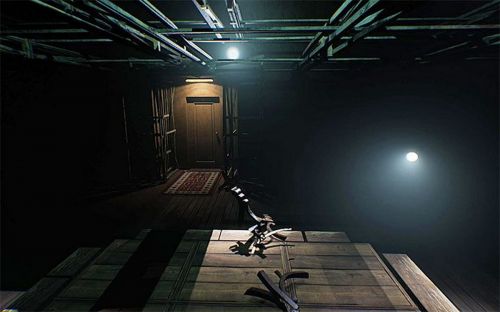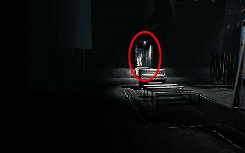 Подходим к манекену, стоящему чуть вдали. Он станет чудищем. Разворачиваемся и начинаем бежать. Проходим по мосткам, обнаруживаем лесенку и поднимаемся по ней. На другой стене под светом видим проем двери. Забегаем в него, когда он подсвечен. Перед открытием дверцы подбираем листок с тумбочки слева.