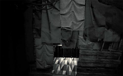 Проходим через дверцу и поднимаем с лавки сумку. С левой стороны расположена сцена со столом и сидящим за ним манекеном. Взаимодействуем с правым рычагом. Сцена повернется и возникнет еще один манекен. Переходим на противоположную сторону и замечаем вторую рукоятку и кнопку.