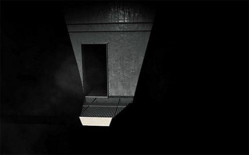Опускаем рукоятку и идем вместе с двигающимся стальным щитом. Проходим по ступенькам, скрываясь за ограждениями. В результате мы окажемся возле манекена и телевизора. Взаимодействуем с ним и слышим тревожную музыку. Выбегаем из комнаты, направляемся в сооружение и замечем белую дверь, но не используем ее сразу.