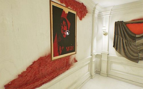 Просто идем по темному коридорчику, проходя мимо всех встречающихся на нашем пути дверей, так как открыть их все равно не удастся. Затем поворачиваем вправо и сворачиваем налево. С левой стороны от картины обнаруживаем дверцу, которую можно отпереть. После этого просматриваем кат-сценку.
