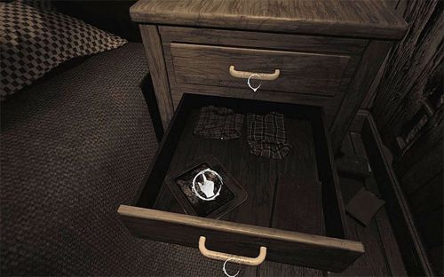 Продолжаем двигаться вперед, и попадаем в длинный коридор. Открываем вторую дверцу с правой стороны для попадания в жилое помещение. Сразу же поворачиваем вправо и находим в прикроватной тумбе 2-ю фотокарточку. Возвращаемся в предыдущую комнату через коридор, так как перед нами возникнет стена.