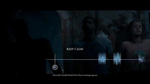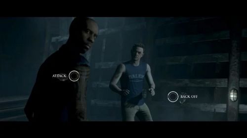 Идем по единственному пути, который нам доступен, и доходим до камеры, где держат Чарли. Он расскажет нам о том, что слышал. Проходим за угол и пытаемся спрятаться от вооруженного врага. Для этого нажимаем на кнопки в такт дыхания Джо, сохраняя спокойствие. Если мы ошибемся, то ничего страшного не случится – солдат сначала наставит автомат на нас, но потом убежит. Однако в будущем такие ошибки могут привести к смерти героя.