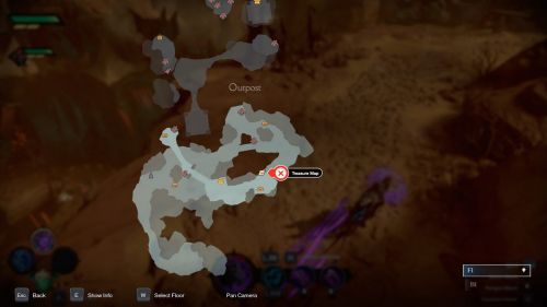 Идем по единственному пути, двигаясь по кругу, и запрыгнув на возвышенность, замечаем наверху карту сокровищ. Берем ее для подсвечивания других ценных предметов. В этой области мы запросто сможем дойти до всех сундучков и коллекционных вещей.