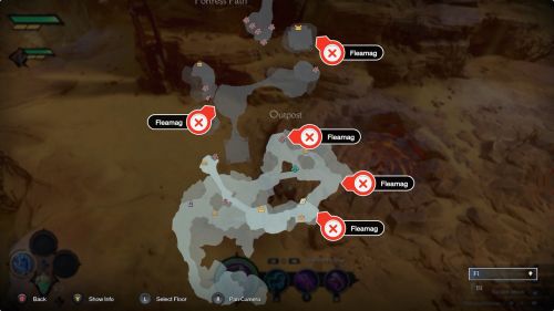 Необходимо будет также разобраться с 9-ю блохишами, которые на карте отмечены красными галочками, до сражения с боссом. Что касается 10-го монстра, то он расположен внизу. Разобравшись с боссом, спускаемся на подъемнике, а потом идем вниз по ступенькам – блохиш окажется с левой стороны.
