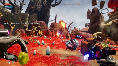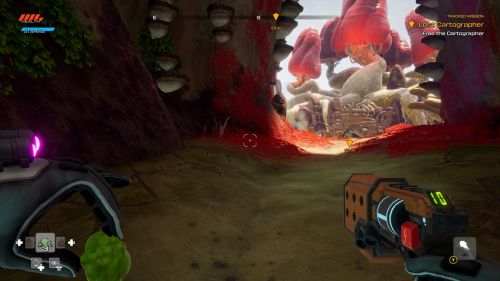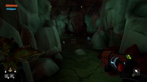 - Прыг-скок-отскок. Первым делом открываем апгрейд «Рикошетный выстрел», с помощью которого наши снаряды будут отскакивать от противников и объектов. Потом направляемся к звездолету и берем с собой как можно больше банок. Теперь идем к огромному черепу, под которым находится пещера с несколькими входами. Используем тот, что слева (рядом с ним растут деревья и бродят пухлоптицы). Заманиваем 3-4 птичек в подземелье, применив приманку. Спускаемся в пещеру и направляем к этим созданиям еще 2-3 их сородичей. Потом заряжаем пистолет, дважды нажимаем на клавишу «R» и выстреливаем, как только пухлоптицы соберутся в одном месте. В результате нам удастся разом убить всех существ.