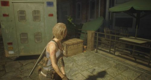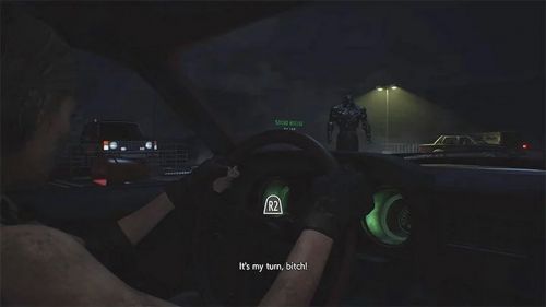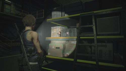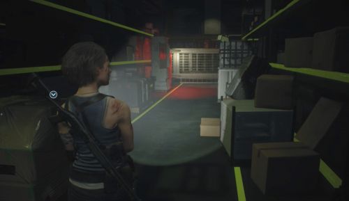 Когда снова вернетесь на основные улицы, на вас накинется Немезис. Уклоняйтесь от его ударов и стреляйте в ответ. Советуем нанести ему как можно больше урона, чтобы он упал и с него выпала Увеличенная обойма для пистолета. В ином случае просто убегайте от него. Вернитесь в автосервис и откройте шкафчик с желтым замком, чтобы взять лечебный спрей.