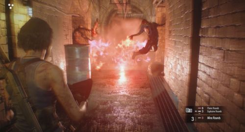 При возвращении назад вам покажут, как трое живых мертвецов отодвигают решетку и оказываются на улице. Можете перестрелять их поодиночке, просто пробежать мимо или заманить к красной бочке, чтобы взорвать всех одним разом (однако мы все же советуем сохранять бочки для грядущих столкновений с Немезисом).