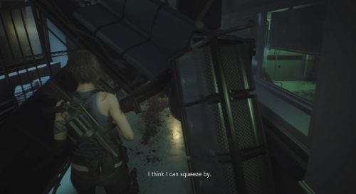 Пройдите в лабораторию и идите через коридор. Вас снова атакует Немезис, причем Тайрелл будет убит. Героиня успеет укрыться за стальной дверью. Пройдите в следующее помещение, где находится контейнер для хранения вещей и печатная машинка. Здесь вы можете также изучить карту комплекса и найти различные расходные материалы.