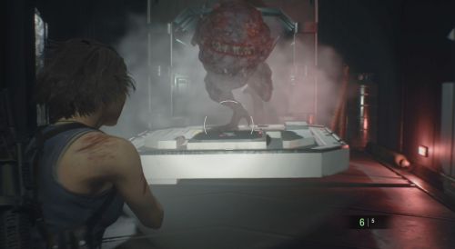 Выйдите в просторный зал в форме круга. Монстр попробует сбросить вас вниз, но Джилл успеет ухватиться за карниз. К ней подойдет Николай, заберет вакцину и сбросит девушку вниз. Здесь вам придется сразиться с Немезисом. Он способен издалека бить щупальцем, поэтому необходимо внимательно следить за ним и вовремя уклоняться. Он может также бить вас с разбегу. Киньте в него все имеющиеся у вас гранаты, а затем используйте снаряды. В конце добейте врага из обычного оружия. На краю арены лежат боеприпасы и спрей.