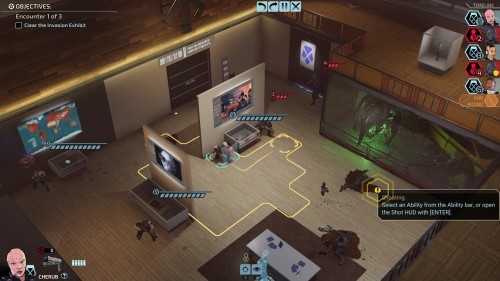 Первое столкновение происходит возле одного парадного входа, поэтому поставьте рядом с ним весь свой отряд. Кстати, все бойцы, которые пройдут через него получат +1 к мобильности на 1 ход. Вам необходимо будет позаботиться о четырех врагах, и в зависимости от ваших целей и количества наносимого урона, решите, стоит ли атаковать всех противников одновременно. В некоторых случаях гораздо эффективнее будет устранять их по отдельности, сосредоточив весь огонь на одном оппоненте.