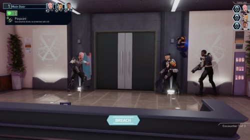 В третьем и последнем столкновении будет одна парадная дверь, где агенты, вероятно, получат урон при попытке проникнуть внутрь. Есть также дверь для сотрудников отдела безопасности – это менее опасный проход, где вы встретите меньше агрессивных противников. Мы поместили Херувима возле парадной двери, чтобы танковать им во время битвы, а остальную часть отряда разместили рядом со вторым входом. Добавим, что если оружие вашего танка будет отключено, то у него все равно останется возможность использовать удар щитом.