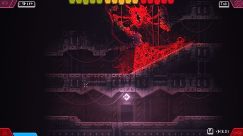 Для этого поверните вправо и используйте там переключатель, чтобы открыть ворота внизу. Пройдите в следующую комнату и следуйте по данному пути, расправляясь со всеми врагами, к проходу внизу. Попав в новую область, разберитесь с дроном и другими врагами, чтобы увеличиться в размерах.