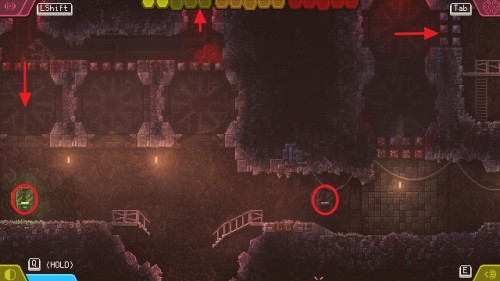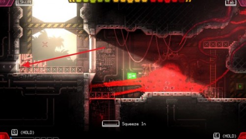 От трубы, из которой вы только что выползли, поверните направо в следующее помещение. Используйте свое щупальце, чтобы нажать на переключатель и открыть дверь, ведущую вниз. Спуститесь, затем уберите клетки в сторону и продолжайте двигаться вправо через трубу в новую локацию.