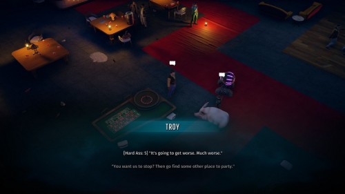 Выходим из здания и проходим в клуб «Маленький Вегас». Если мы разобрались с Фараном Брайго, то он теперь окажется заброшенным. Поднимаемся на 2-й ярус и беседуем с Хорхе, сидящим за столиком. Предлагаем ему поиграть на своей базе. Далее спускаемся и стараемся решить проблему с Троем мирным путем. Взаимодействуем с Дискоботом с правой стороны и начинаем двигаться, следуя ритму. Когда наши движения оценят присутствующие, снова говорим с Троем и приглашаем его поучаствовать в нашей вечеринке.