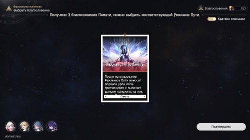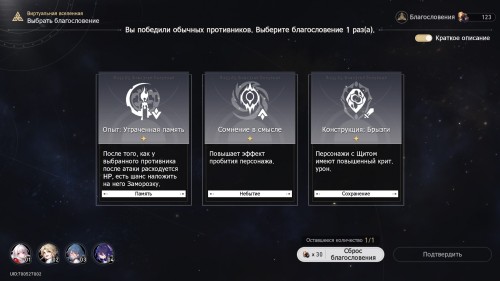 Босс будет ждать вас в конце Мира. С его уязвимостями тоже можно ознакомиться на страничке выбора отряда. Вообще команду обычно собирают, исходя как раз таки из слабостей главного врага. Теперь рассмотрим ключевые механики Виртуальной вселенной: благословения, диковины и выбор Пути.