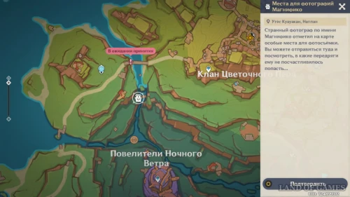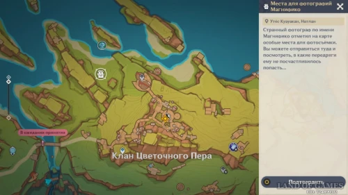 - Как начать: нужно найти метку фотоаппарата на карте — она будет расположена на юго-западе от территории Клана Цветочного пера — и прийти на место съемки.