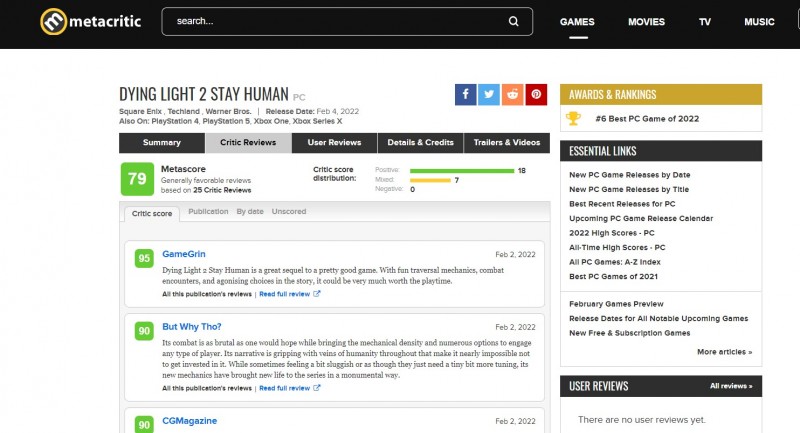 Вчера спало эмбарго на публикацию обзоров Dying Light 2 Stay Human, поэтому в сети начали появляться первые оценки на игру. Многие из них оказались положительными, поэтому средний рейтинг проекта на «Метакритике» сейчас составляет 79 баллов из 100 возможных.