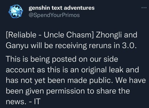 Однако мы все же пока будем считать, что после апдейта 2.8 выйдет 3.0. Кстати, в этой версии, по словам информатора SpendYourPrimos, может состояться реран Чжун Ли и Гань Юй (возможно, будет двойной баннер). Эти сведения они получили от датамайнера Uncle Chasm, ранее слившего информацию о молитвах патча 2.7 за пару месяцев до его выхода.