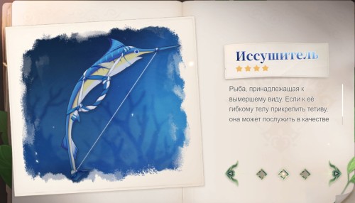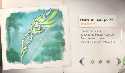 Для оружейного баннера подготовили новый легендарный лук «Охотничья тропа», который окажется сигнатурным для Тигнари. В рамках одного из ивентов можно будет получить 4-звездочный лук «Иссушитель». Появится также целая линейка нового крафтового оружия из Сумеру. Для их создания нужно будет вначале заполучить соответствующие рецепты.