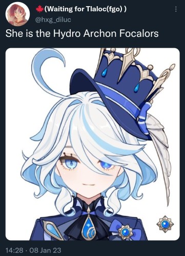 Третьей девушкой в синем костюме и белых шортах является Гидро Архонтом по имени Фокалорс (Сутин). Эту информацию подтвердил проверенный инсайдер hxg_diluc. Отмечается, что в бою она будет использовать двуручный меч. Согласно ранее утекшей информации, эта героиня возглавляет некую фракцию Тьмы.