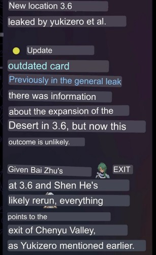 Сегодня же команда инсайдеров Paimon_Leaks снова сослалась на данную утечку, заявив, что в апдейте 3.6 будет добавлен чайный регион вместо пустыни. Не ясно, является ли данное сообщение просто их догадками или они получили новые сведения, подтверждающие слова Yukizero. В качестве доказательств для своей теории информаторы лишь приводят возможный реран Шэнь Хэ и выход Бай Чжу в указанном обновлении.