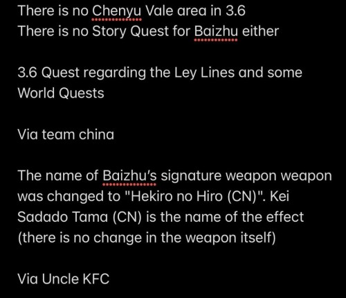 Инсайдер Uncle KFC сообщил, что в патче 3.6 для Genshin Impact разработчики не собираются расширять Ли Юэ, вводя Долину Чэньюй вместе с новой деревней, и добавлять задание легенд Бай Чжу. Команда лишь планирует сделать несколько новых мировых квестов. Он также рассказал о смене названия сигнатурного оружия владельца Хижины «Бубу» на «Hekiro no Hiro».