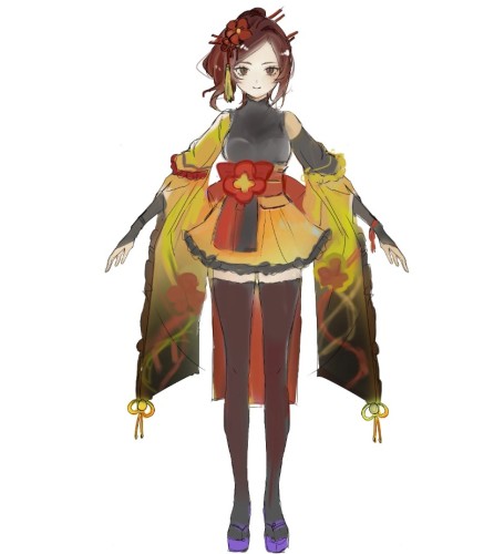 - Возле левой груди на одежде висит один оранжевый цветок.